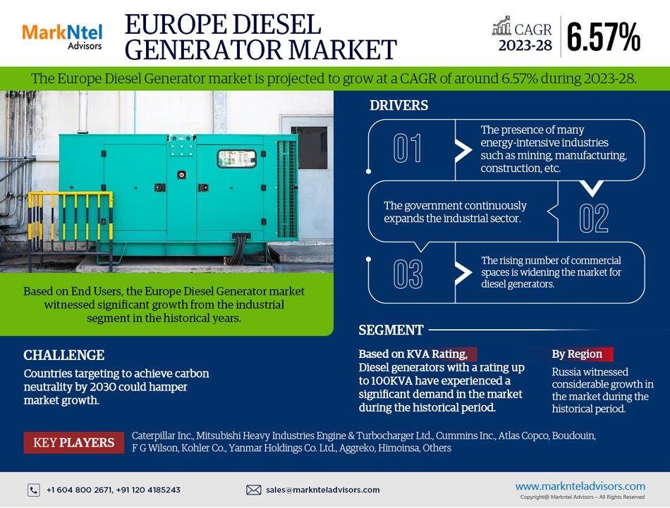 As per recent study by MarkNtel Advisors The Europe Diesel Generator market is projected to grow at a CAGR of around 6.57% during the forecast period, i.e., 2023-28.