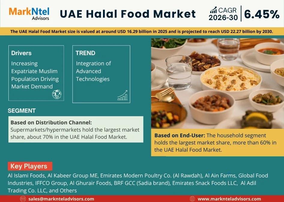 According to MarkNtel Advisors study The future of UAE Halal Food Market size is valued at around USD 16.29 billion in 2025 and is projected to reach USD 22.27 billion by 2030. Along with this, the market is estimated to grow at a CAGR of around 6.45% during the forecast period, i.e., 2026-30.