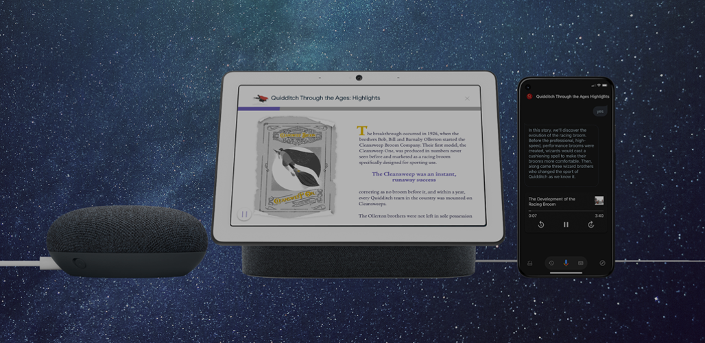 Users can select these excerpts using simple voice commands or gestures on compatible on-screen devices like Google Nest Hub or smartphones equipped with Google Assistant. As they listen, they can follow along with animated illustrations, pull quotes, and text from the Hogwarts library book, enhancing the storytelling experience.