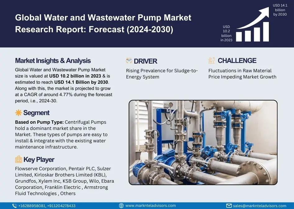 As per recent study by Markntel Advisors The Global Water & Wastewater Pumps Market size is valued at USD 10.2 billion in 2023 & is estimated to reach USD 14.1 billion by 2030. Along with this, the market is projected to grow at a CAGR of around 4.77% during the forecast period, i.e., 2024-30.