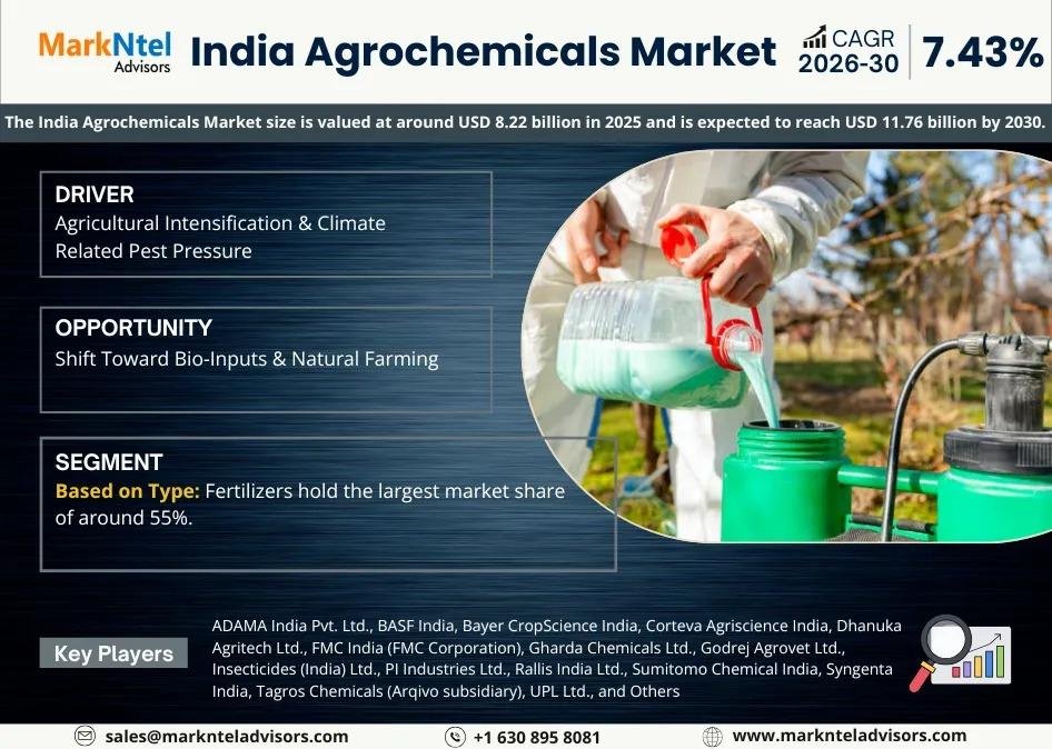 As per recent study by Markntel Advisors The India Agrochemicals Market size is valued at around USD 8.22 billion in 2025 and is expected to reach USD 11.76 billion by 2030. Along with this, the market is estimated to grow at a CAGR of around 7.43% during the forecast period, i.e., 2026-30.
