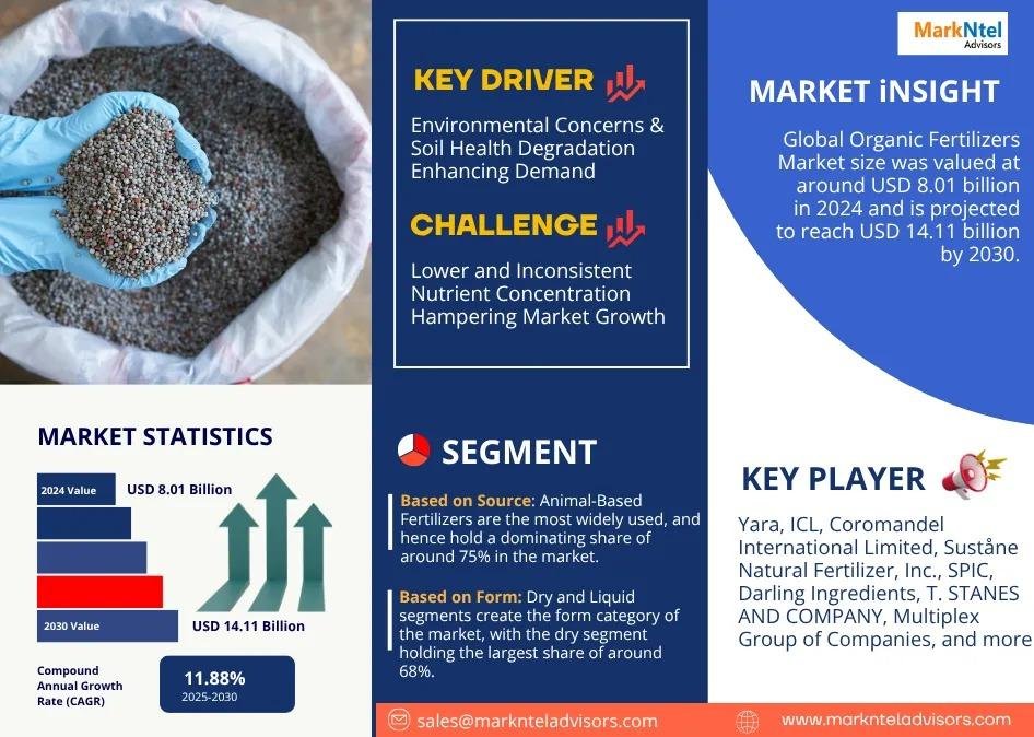 As per recent study by Markntel Advisors The Global Organic Fertilizers Market size was valued at around USD 8.01 billion in 2024 and is projected to reach USD 14.11 billion by 2030. Along with this, the market is estimated to grow at a CAGR of around 11.88% during the forecast period, i.e., 2025-30.