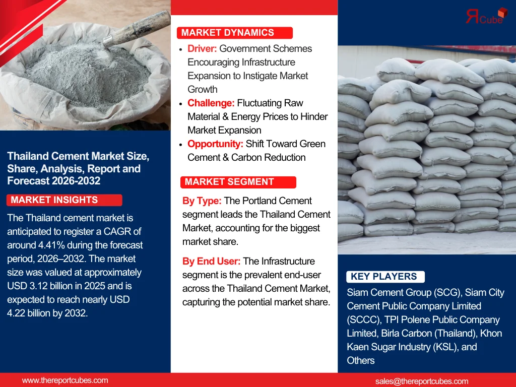 According to the latest report by The Report Cube, study Thailand Cement Market is anticipated to register a CAGR of around 4.41% during the forecast period, 2026–2032. The market size was valued at approximately USD 3.12 billion in 2025 and is expected to reach nearly USD 4.22 billion by 2032. The country's expanding construction & infrastructure industries, driven by rapid urbanization & government-backed advancement efforts, are driving the industry forward. Megaprojects like high-speed rail, airport expansions, and smart city initiatives as part of the Eastern Economic Corridor (EEC) initiative have a noteworthy impact on market demand.