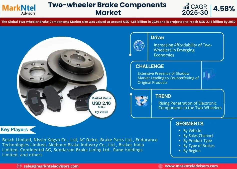 The Global Two-wheeler Brake Components Market size was valued at around USD 1.65 billion in 2024 and is projected to reach USD 2.16 billion by 2030. Along with this, the market is estimated to grow at a CAGR of around 4.58% during the forecast period, i.e., 2025-30. According to MarkNtel Advisors Study.