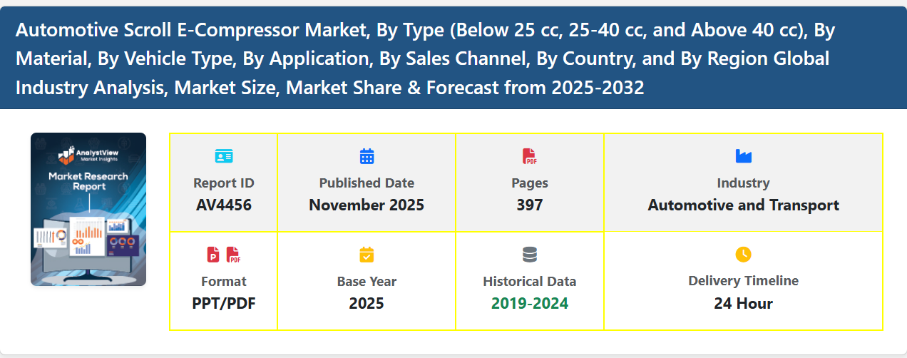 ● Detailed Market Understanding: Gain insights into key drivers, restraints, trends, and growth opportunities shaping the automotive scroll E-compressor market.
