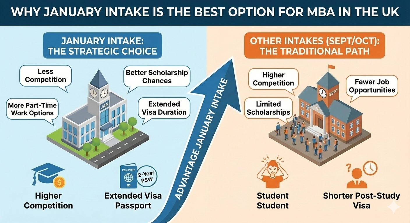 Most students chasing an MBA in the UK automatically think September is the only proper start, it's the main one, biggest buzz, full campus life. But January intake has been picking up quietly, and honestly, it fits a lot of people better, especially if you need a bit more time to sort things or just don't want the massive September fight. Not the super-elite schools like Oxford or LBS run January MBAs, but plenty of solid, practical ones do, and they give real career punch without the insane competition. As education consultants working with Indian applicants for UK business programs, we see January clicking really well for MBA folks who want flexibility and a smoother run. Let me go through why it often comes out on top.