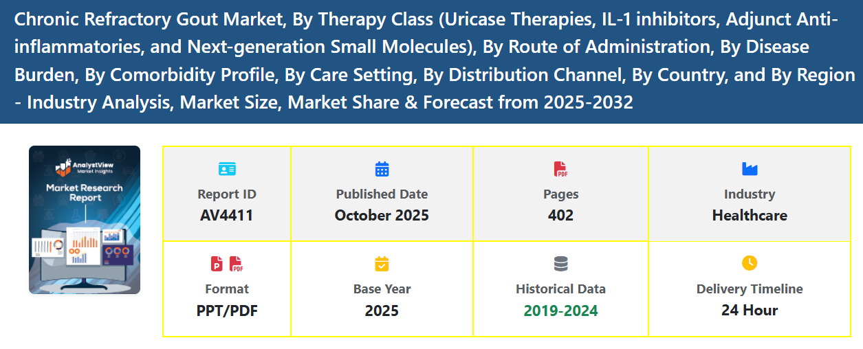 The Chronic Refractory Gout Market is witnessing steady growth as the prevalence of gout and related comorbidities continues to rise worldwide. Chronic refractory gout is a severe form of gout that does not respond adequately to conventional urate-lowering therapies, resulting in persistent uric acid crystal deposition, joint inflammation, and tophi formation. Patients often face debilitating pain, decreased mobility, and long-term joint damage, creating an urgent need for effective therapeutic interventions.