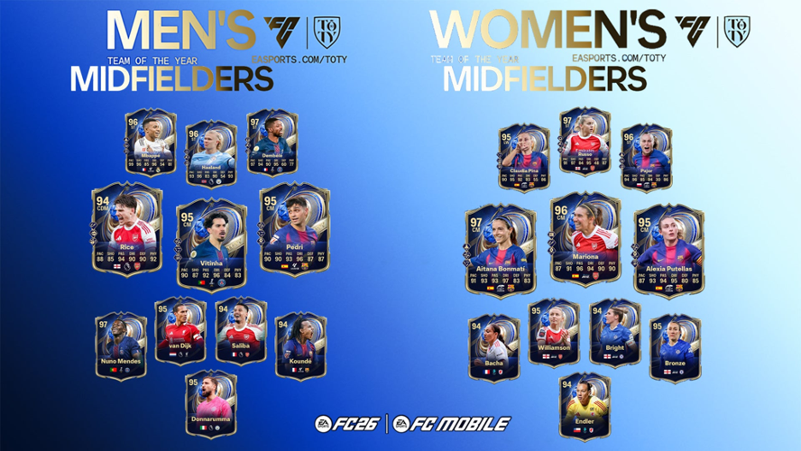Nach der offiziellen Enthüllung der Team of the Year (TOTY) XI für Herren und Frauen bei EA Sports FC 26 beginnt nun die schrittweise Veröffentlichung der Top-Spieler. Während die Stürmer bereits einen kurzen Auftritt im Spiel hatten, sind nun die Mittelfeldprofis an der Reihe, die in der TOTY-Umfrage die meisten Stimmen erhalten haben. Diese Spieler werden für einige Tage exklusiv in Packs erhältlich sein.